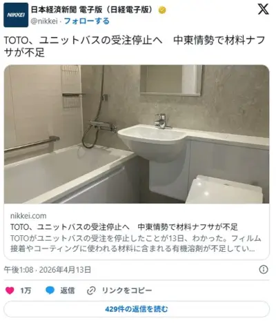 TOTO、ユニットバスの受注停止へ ホルムズ封鎖で材料ナフサ不足
