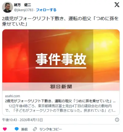 2歳児がフォークリフト下敷き、運転の祖父「つめに孫を乗せていた」