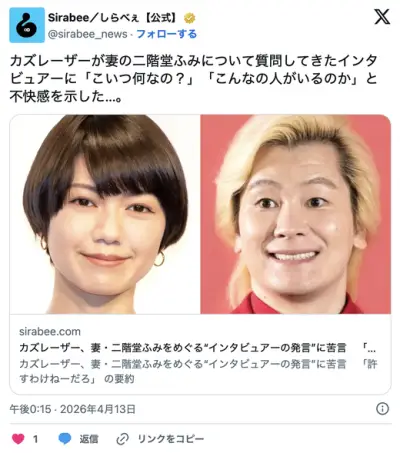 カズレーザー、「奥様、かなりあげまんですよね」インタビュアーの発言に苦言「許すわけねーだろこいつ何なの?」「すげー嫌な気持ち」