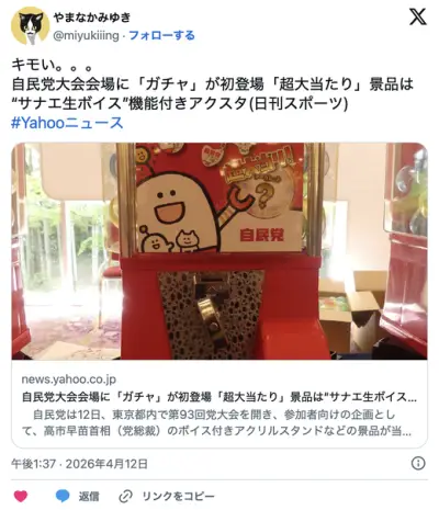 自民党大会会場に「ガチャ」が初登場「超大当たり」景品は“サナエ生ボイス”機能付き⋯