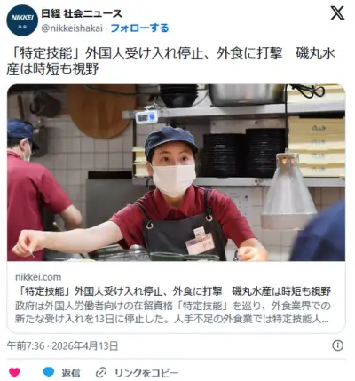【特定技能】外国人受け入れ停止、外国人を積極雇用していた外食チェーン点が悲鳴「磯丸水産は時短も視野」