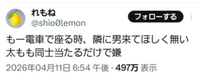 【炎上】フェミ「電車で座る時、隣に男来てほしく無い。太もも同士当たるだけで嫌」→体重74.6kgの女性と判明してツッコミ殺到→鍵垢にして逃亡wwwww