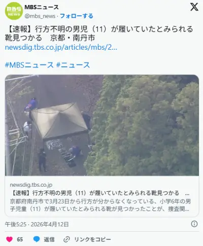 行方不明の男児(11)が履いていたとみられる靴見つかる 京都・南丹市 小学校から南西に約6㎞離れた山中