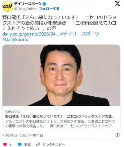 野口健氏「えらい事になっています 北海道・ニセコのドラッグストアの酒の値段が衝撃過ぎ「治外法権やん」の声も