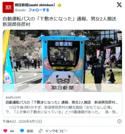 【自動運転】バスの「下敷きになった」通報、男女2人搬送 新潟県弥彦村