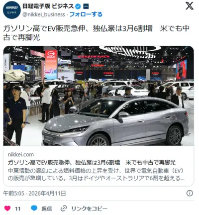【EV】ガソリン高で販売急伸、独仏豪は3月6割増 米でも中古で再脚光