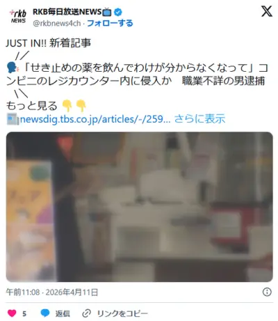 【福岡】「せき止めの薬を飲んでわけが分からなくなって暴れたんだと思う」コンビニのレジカウンター内に侵入か 職業不詳の22歳男逮捕