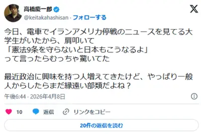 列車内で「憲法 9条を守らないとこうなるよ」と肩を叩いてくる不審者事案