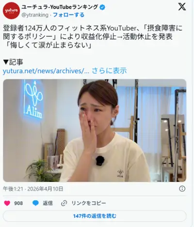 登録者124万人のフィットネス系YouTuber、摂食障害のポリシー抵触で収益化停止され活動休止 「悔しくて涙が止まらない」