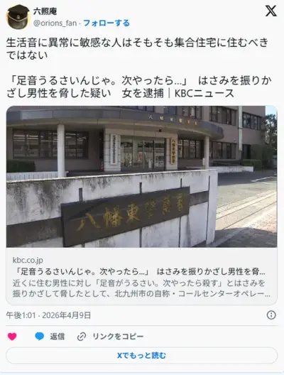 【生活音/福岡】「足音うるさいんじゃ。次やったら…」はさみを振りかざし男性を脅した疑い 女を逮捕 北九州市