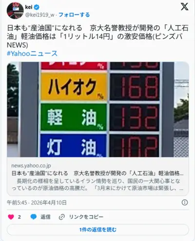 日本も“産油国”になれる 京大名誉教授が開発の「人工石油」軽油価格は「1リットル14円」の激安価格