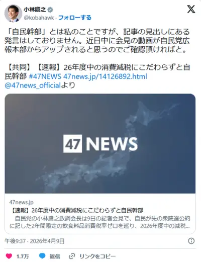 共同通信、自民幹部の発言を捏造か 小林政調会長「記事の見出しにある発言はしておりません」