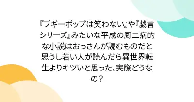 『ブギーポップは笑わない』や『戯言シリーズ』みたいな平成の厨二病的な小説はおっさんが読むものだと思うし若い人が読んだら異世界転生よりキツいと思った、実際どうなの?
