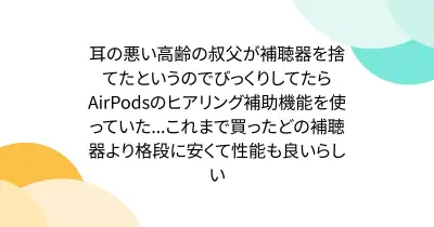 耳の悪い高齢の叔父が補聴器を捨てたというのでびっくりしてたらAirPodsのヒアリング補助機能を使っていた...これまで買ったどの補聴器より格段に安くて性能も良いらしい