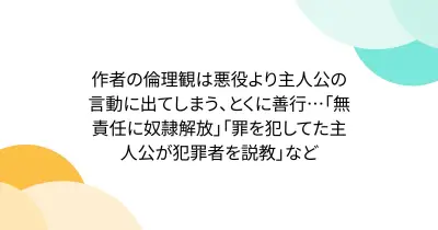 作者の倫理観は悪役より主人公の言動に出てしまう、とくに善行…「無責任に奴隷解放」「罪を犯してた主人公が犯罪者を説教」など