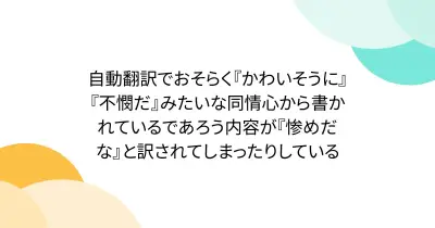 自動翻訳でおそらく『かわいそうに』『不憫だ』みたいな同情心から書かれているであろう内容が『惨めだな』と訳されてしまったりしている