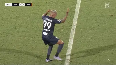 四国ダービーで決勝点を挙げた徳島ヴォルティスFWルーカス・バルセロスが阿波踊りを披露