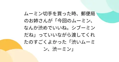 ムーミン切手を買った時、郵便局のお姉さんが「今回のムーミン、なんか渋めでいいね。シブーミンだね」っていいながら渡してくれたのすごくよかった「渋いムーミン、渋ーミン」