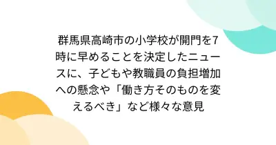 群馬県高崎市の小学校が開門を7時に早めることを決定したニュースに、子どもや教職員の負担増加への懸念や「働き方そのものを変えるべき」など様々な意見