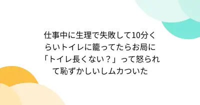 仕事中に生理で失敗して10分くらいトイレに籠ってたらお局に「トイレ長くない?」って怒られて恥ずかしいしムカついた
