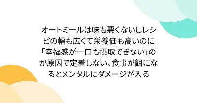 オートミールは味も悪くないしレシピの幅も広くて栄養価も高いのに「幸福感が一口も摂取できない」のが原因で定着しない、食事が餌になるとメンタルにダメージが入る