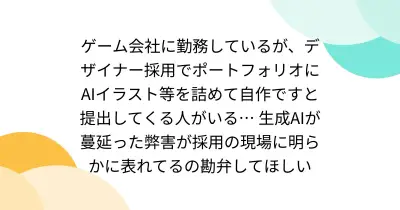ゲーム会社に勤務しているが、デザイナー採用でポートフォリオにAIイラスト等を詰めて自作ですと提出してくる人がいる… 生成AIが蔓延った弊害が採用の現場に明らかに表れてるの勘弁してほしい
