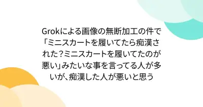 Grokによる画像の無断加工の件で「ミニスカートを履いてたら痴漢された?ミニスカートを履いてたのが悪い」みたいな事を言ってる人が多いが、痴漢した人が悪いと思う