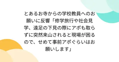 とあるお寺からの学校教員へのお願いに反響「修学旅行や社会見学、遠足の下見の際にアポも取らずに突然来山されると現場が困るので、せめて事前アポぐらいはお願いします」