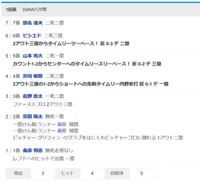 【巨人対DeNA15回戦】DeNA、4回表2アウト一二塁から桑原のタイムリーツーベースでリードを再び3点差に広げる!!!!!