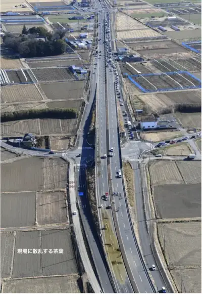 【国道50号】車十数台事故、1人死亡 荷台から茶葉、後続車スリップ