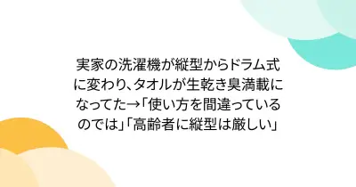 実家の洗濯機が縦型からドラム式に変わり、タオルが生乾き臭満載になってた→「使い方を間違っているのでは」「高齢者に縦型は厳しい」
