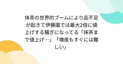 抹茶の世界的ブームにより品不足が起きて伊藤園では最大2倍に値上げする騒ぎになってる「抹茶まで値上げ…」「増産もすぐには難しい」