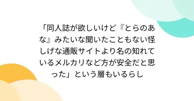 「同人誌が欲しいけど『とらのあな』みたいな聞いたこともない怪しげな通販サイトより名の知れているメルカリなど方が安全だと思った」という層もいるらし