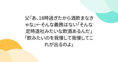 父『あ、18時過ぎたから酒飲まなきゃな』←そんな義務はない「そんな定時退社みたいな飲酒あるんだ」「飲みたいのを我慢して我慢してこれが出るのよ」