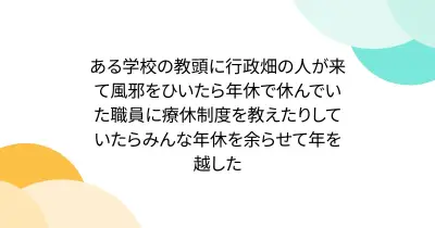 ある学校の教頭に行政畑の人が来て風邪をひいたら年休で休んでいた職員に療休制度を教えたりしていたらみんな年休を余らせて年を越した