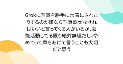 Grokに写真を勝手に水着にされたりするのが嫌なら写真載せなければいいと言ってくる人がいるが、芸能活動してる限り絶対無理だし、やめてって声をあげて言うことも大切だと思う