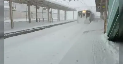 特殊車のような光景になってる 青森県の駅で積もった大雪を掻き分けつつ進む電車に規格外のパワーを見る