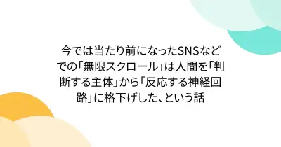 今では当たり前になったSNSなどでの「無限スクロール」は人間を「判断する主体」から「反応する神経回路」に格下げした、という話
