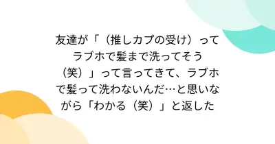 友達が「(推しカプの受け)ってラブホで髪まで洗ってそう(笑)」って言ってきて、ラブホで髪って洗わないんだ…と思いながら「わかる(笑)」と返した