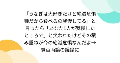 「うなぎは大好きだけど絶滅危惧種だから食べるの我慢してる」と言ったら「あなた1人が我慢したところで」と笑われたけどその積み重ねが今の絶滅危惧なんだよ→賛否両論の議論に
