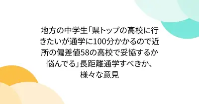 地方の中学生「県トップの高校に行きたいが通学に100分かかるので近所の偏差値58の高校で妥協するか悩んでる」長距離通学すべきか、様々な意見