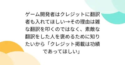 ゲーム開発者はクレジットに翻訳者も入れてほしい→その理由は雑な翻訳を叩くのではなく、素敵な翻訳をした人を褒めるために知りたいから「クレジット掲載は功績であってほしい」