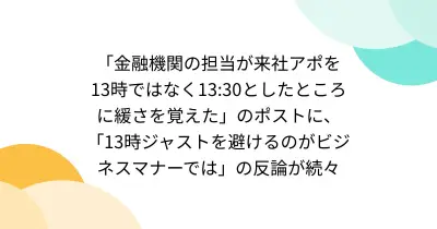 「金融機関の担当が来社アポを13時ではなく13:30としたところに緩さを覚えた」のポストに、「13時ジャストを避けるのがビジネスマナーでは」の反論が続々