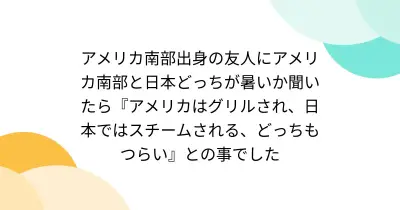 アメリカ南部出身の友人にアメリカ南部と日本どっちが暑いか聞いたら『アメリカはグリルされ、日本ではスチームされる、どっちもつらい』との事でした