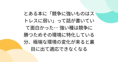 とある本に「競争に強いものはストレスに弱い」って話が書いていて面白かった… 強い種は競争に勝つためその環境に特化している分、極端な環境の変化が来ると裏目に出て適応できなくなる