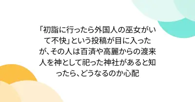 「初詣に行ったら外国人の巫女がいて不快」という投稿が目に入ったが、その人は百済や高麗からの渡来人を神として祀った神社があると知ったら、どうなるのか心配