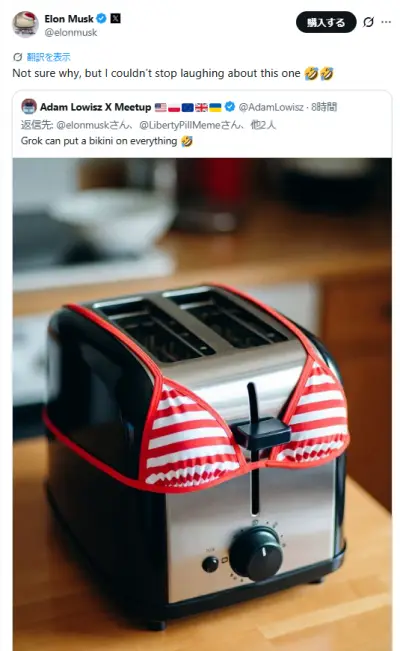 X民「AIで何でもビキニ姿に出来るぞ!」イーロンマスク「ギャハハハハ!」
