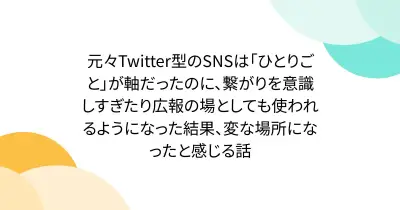 元々Twitter型のSNSは「ひとりごと」が軸だったのに、繋がりを意識しすぎたり広報の場としても使われるようになった結果、変な場所になったと感じる話