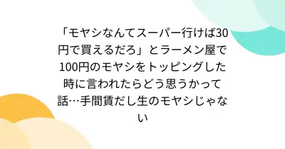 「モヤシなんてスーパー行けば30円で買えるだろ」とラーメン屋で100円のモヤシをトッピングした時に言われたらどう思うかって話…手間賃だし生のモヤシじゃない