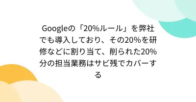 Googleの「20%ルール」を弊社でも導入しており、その20%を研修などに割り当て、削られた20%分の担当業務はサビ残でカバーする